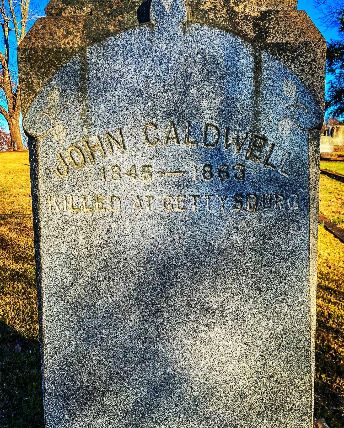 Lieut. Caldwell’s commanding officer Col. Avery in letter to John’s father wrote “You may have the satisfaction to know that he fell where we would all wish to fall (if it be God will) with his face to the enemy.’[10] Lieut. John Caldwell’s body was buried on Seminary Ridge that night “near “two honey-pod trees … not far from an old two-story house.”[11] Even with the reports of Lieut. Caldwell falling before the enemy, his father refused to believe his son was killed.