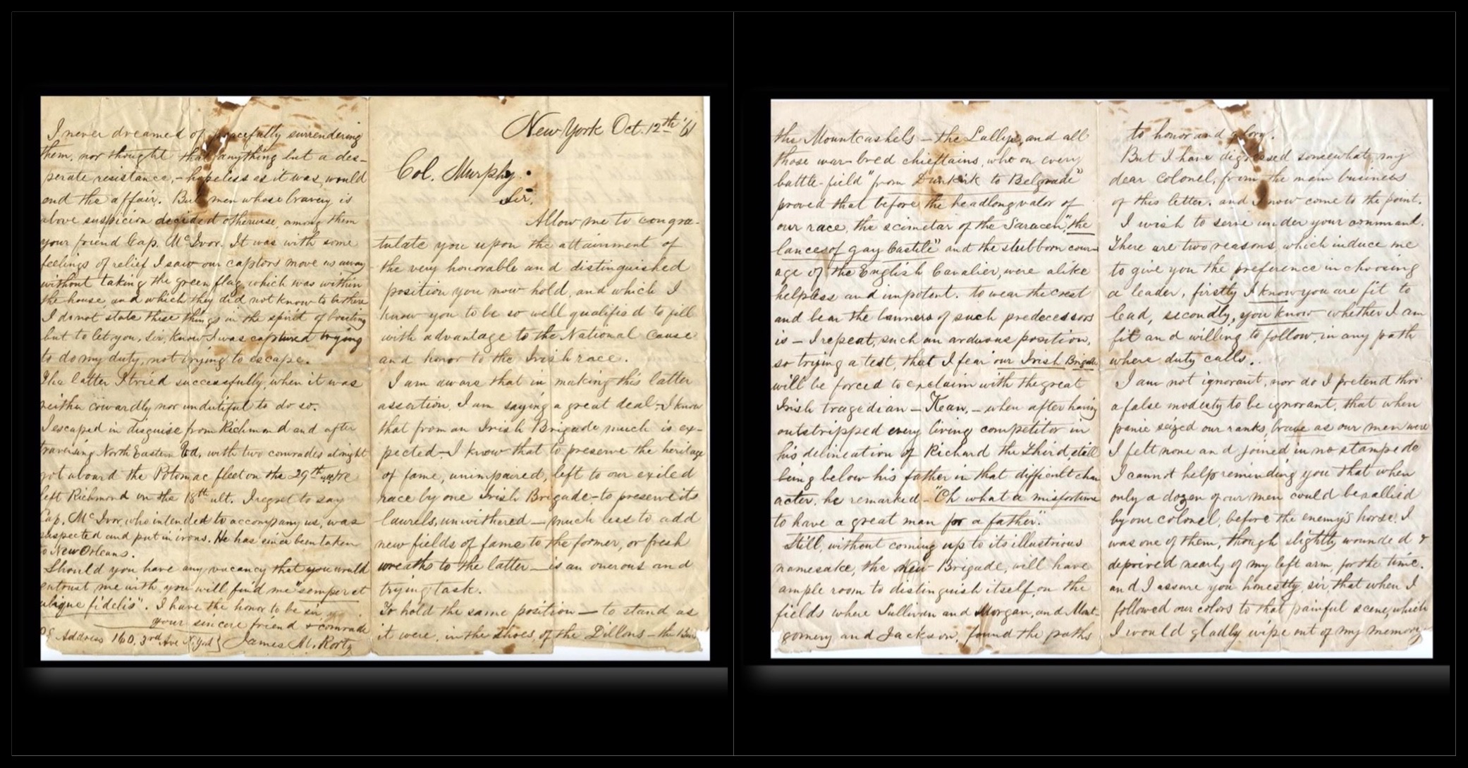 Sometimes one finds an artifact that connects so much history. This letter composed by Captain James McKay Rorty to Colonel Mathew Murphy, is one such artifact. Both men were of Irish birth, and dedicated to the cause of Irish freedom. Sadly they would also share the same fate of being killed in battle during the American Civil War. Here are their stories…..