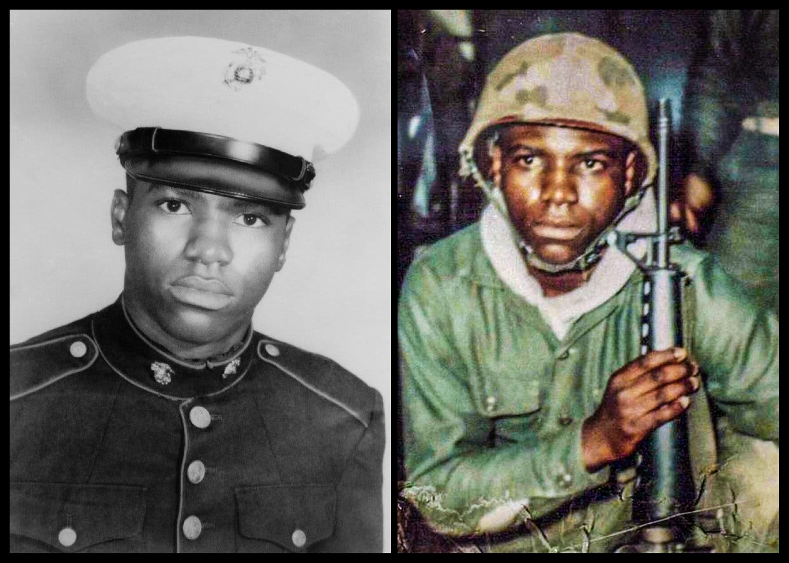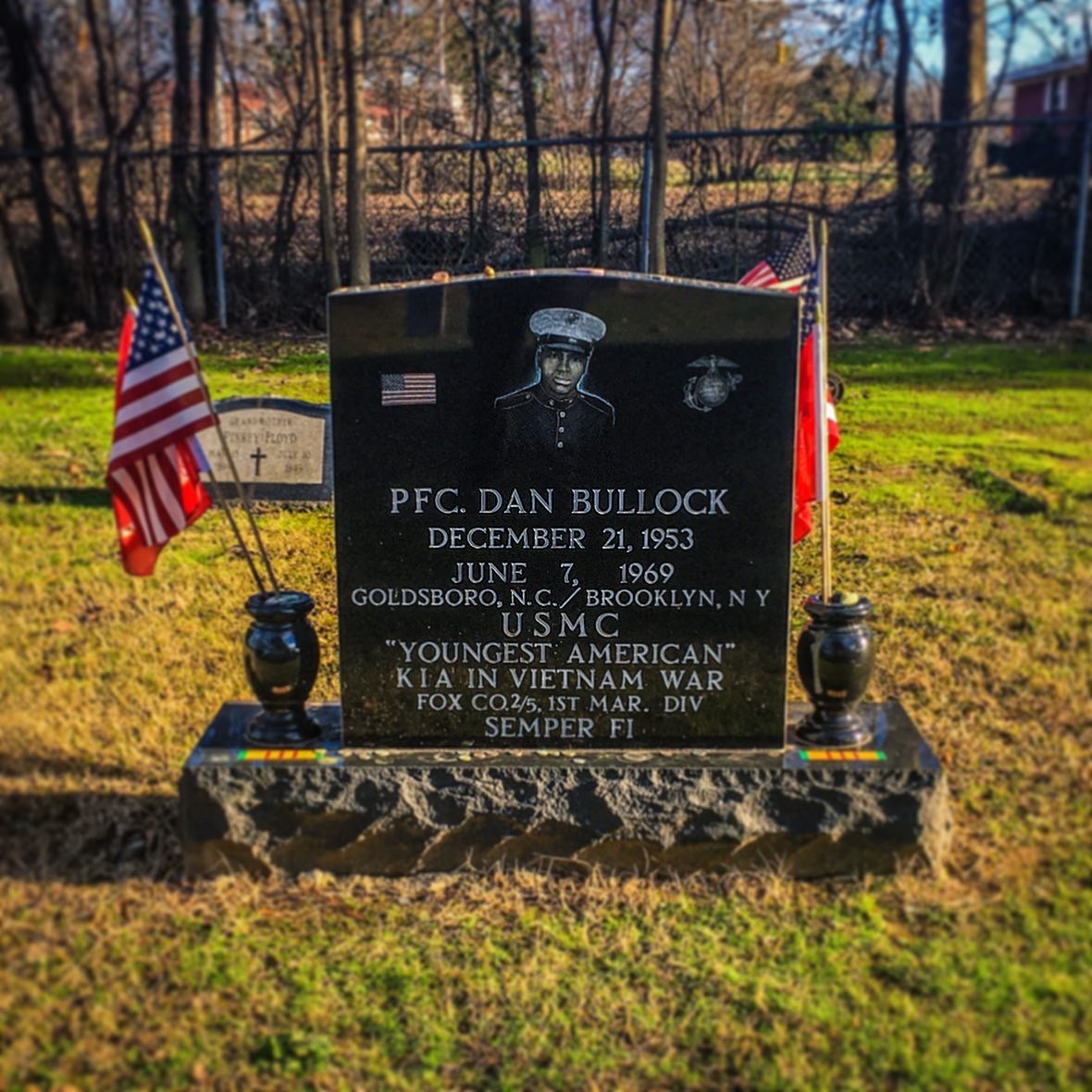 As a child Dan and his young nephew Nathan Bullock would play soldier and have other “childhood escapades”. [2] Dan’s Father would also fuel his desire for adventure by telling him stories of the Tuskegee Airmen and Buffalo Soldiers.[3] Sadly PFC Bullocks mother would die when he was just 11. This prompted his father to move the family to Brooklyn in order to find work.[4] Even with the move, the Bullock family was still struggling finically. This, along with Dan’s sense adventure, are possible motivations for him to join the United States Marine Corp. He enlisted on December 10, 1968 at the age of 14.[5] Dan changed his birth certificate to read December 21, 1949, instead of December 21, 1953 in order to join the Marines.[6] That combined with the fact that Dan was five feet nine inches tall, and 160 pounds fooled the recruiters.[7] His father was against Dan’s enlistment at first but due to PFC. Bullocks enthusiasm elder Bullock relented.[8] Dan was sent to Paris Island South Carolina, where according to Franklin McArthur his “Boot Camp Buddy” Dan almost washed out.[9] PCF Bullock would complete his basic training and be assigned as a rifleman to Fox Company, Second Battalion, Fifth Marine Regiment. He was sent to Vietnam on May 8, 1969 and was stationed at An Hoa Combat Base in Quang Nam Province.[10] According to his nephew Nathan Dan would right home and he once reported “I had a buddy who got shot, but I don’t have no holes in me yet.”[11] Even in his last letter home Dan added a post script “I don’t have no holes in me yet. “tragically his good fortune would change. On June 7th, 1969 PCF Bullock was at first assigned cleanup duties that night at the base, he was reassigned to take over a wounded Marine’s assignment, guarding a Delta Airship. At 1am a group of North Vietnamese Army attacked the base, PFC Bullock “constantly exposed himself to the enemy fire in order to keep the company supplied with the ammunition needed to hold off the attack, As the attack pressed on, Dan again went to get more ammunition when he was mortally wounded by a burst of enemy small arms and died instantly.” wrote Capt. R.H. Kingrey his commanding officer.[12] PFC Bullock was just 15 years old. His body was returned to Goldsboro, where he was laid to rest wearing his dress blues.