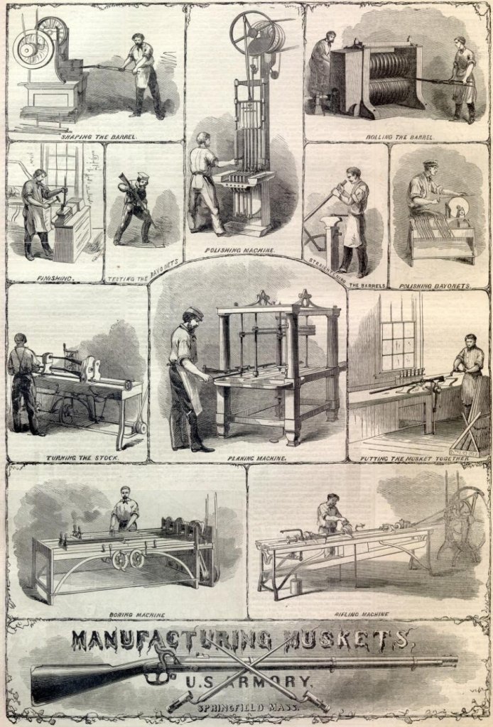 The southern states not only had a shortage of able-bodied men for combat but also lacked the industrial capability of the North. Unlike the northern states, which had numerous factories like the Springfield Armory, the South struggled to produce arms and munitions. The northern states produced 32 times more firearms than the southern states. This is to say that the North produced 3,200 firearms for every 100 made in the South.[40] This was a problem for the southern states because it forced them to obtain many of their armaments from outside the country. Any loss of munitions or a means to produce them was disastrous to the Confederacy’s efforts.