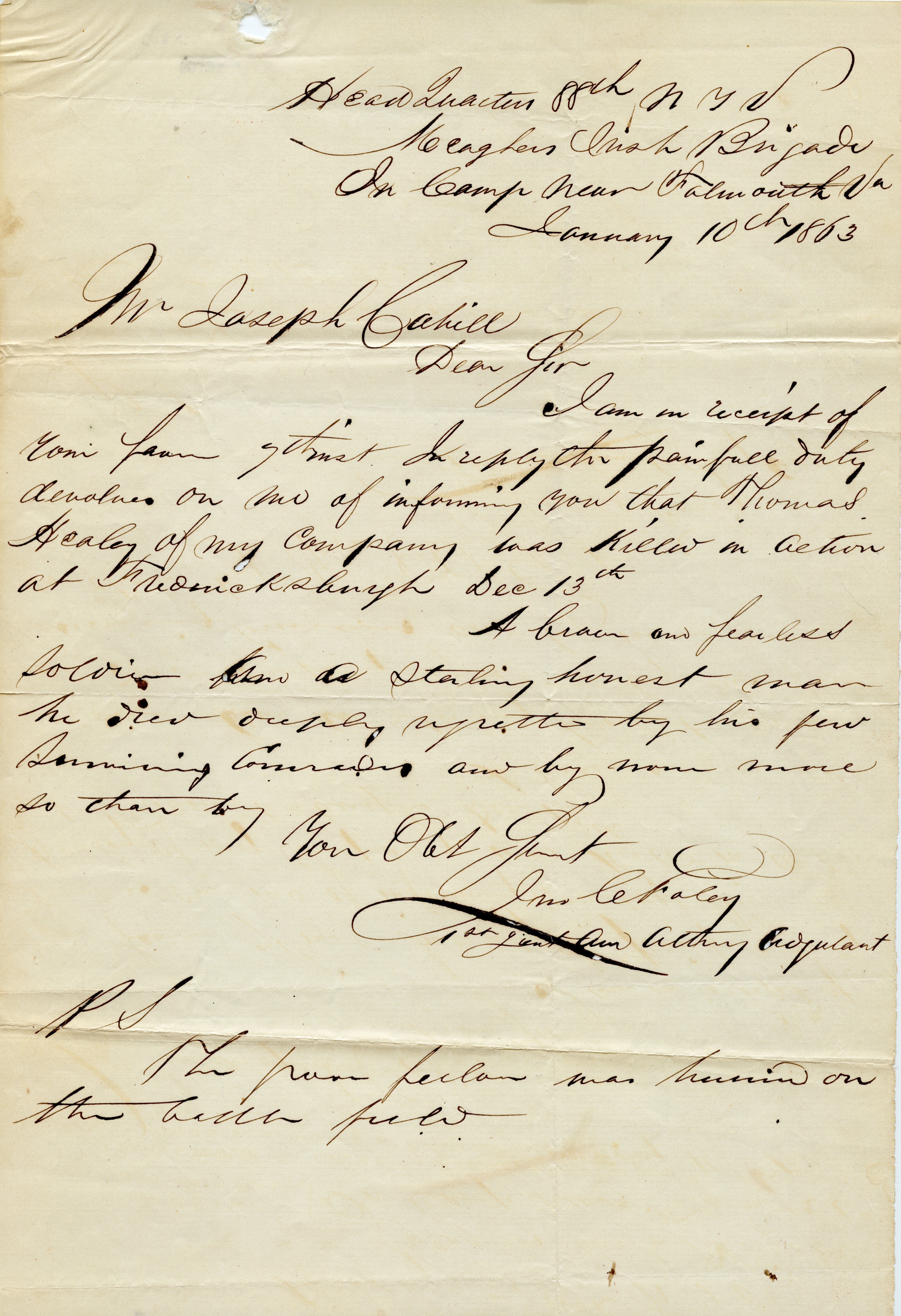 I am in receipt of your letter 9th (unreadable). In reply, the painful duty devolves on me of informing you that Thomas Healey of my company was killed in action at Fredericksburg December 13.