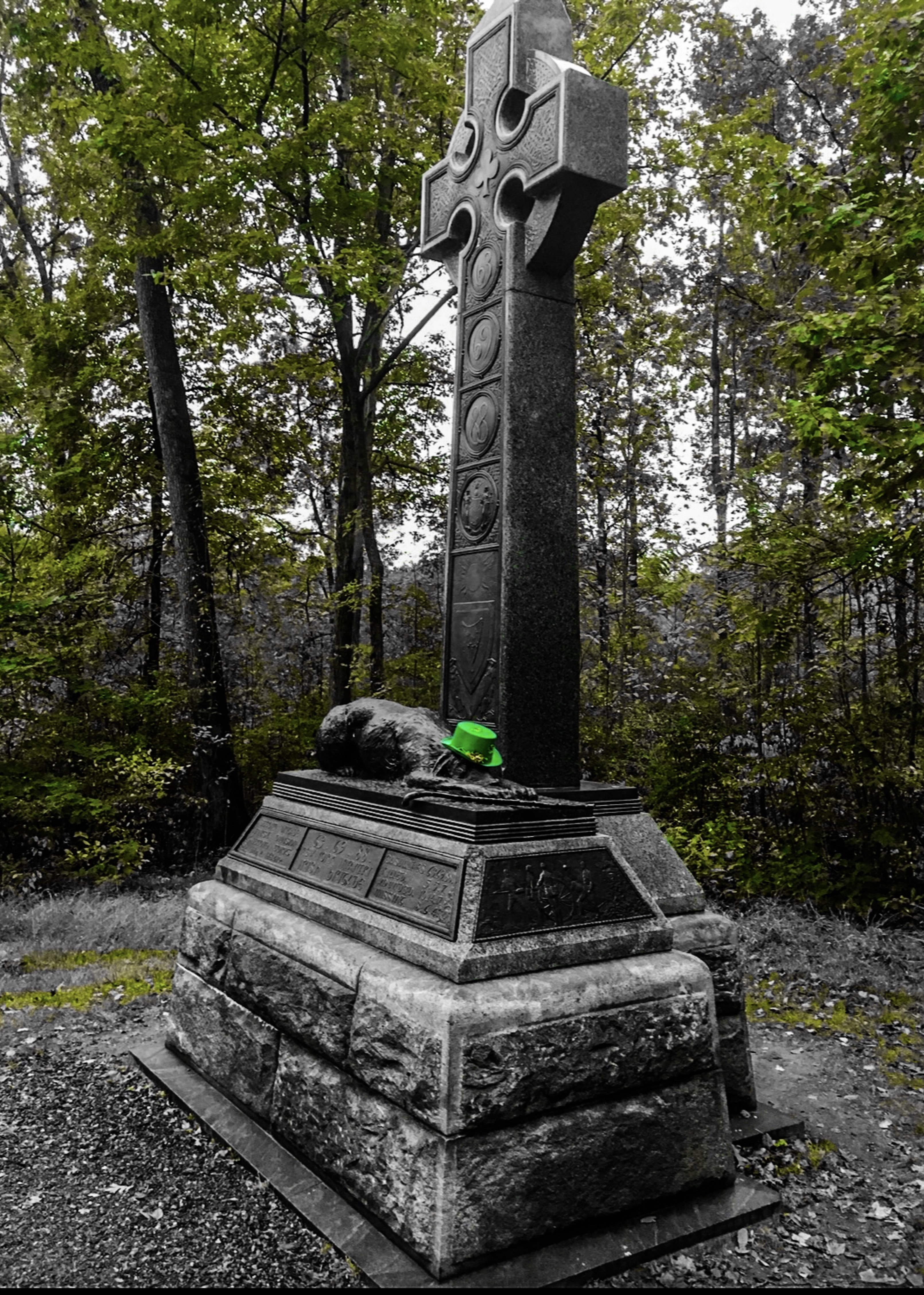 “Each part of the field and each portion of the day has its incidents. Around-shot ricochets strikes with a dull, heavy sound the body of a fine brave fellow in the front rank and bounds over him. He is stone dead; the two men on each side of him, touching him as they lay, rise up, lift the stiff corpse, lay it down under a tree in the rear, cover his face with his blanket, come back to the old place, lie down on the same old fatal spot, grasp the musket again without saying a word. How brave, how cool, how dauntless these men are! A hundred thousand of these Celts would- but no matter: what is speculation here? That shell came very near-scattered a portion of it strikes Lieutenant Foley, of the Eighty-eighth, stuns him for a time; he recovers, will recover.”[5]