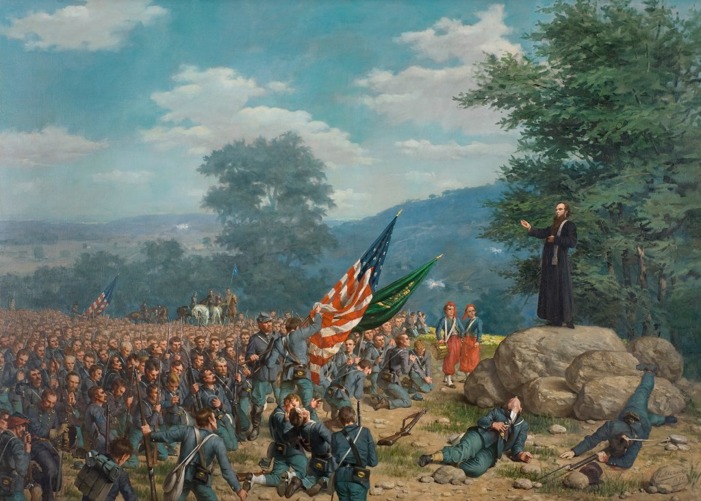 Father William Corby, the brigade’s chaplain, stood atop a large rock before Brady and the assembled men of the 116th, who stood in silent formation, awaiting their fate. Knowing the bloodshed that lay ahead, Father Corby offered them general absolution, a sacred rite rarely seen outside of European battlefields. With heads bowed and knees in the dirt, the soldiers received his blessing as he extended his hand over them, his voice carrying the ancient Latin words of forgiveness: