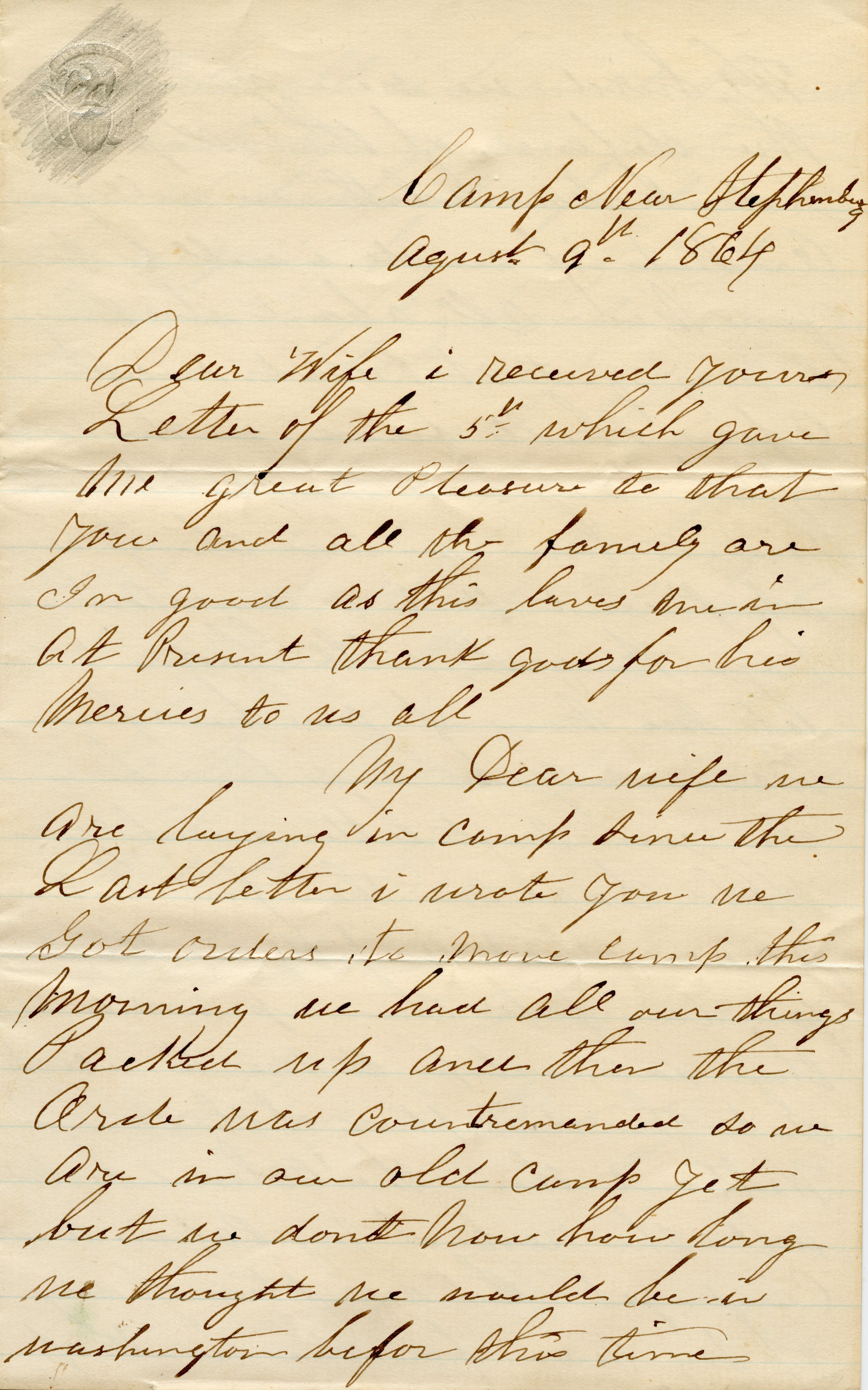 I received your letter of the 5th which gave me great pleasure seeing that you and all the family are in good, as this leaves me in at present. Thank God for his mercies to us all. My dear wife, we are laying in camp since the last letter I wrote you. We got orders to move camp this morning. We had all our things packed up, and then the order was countermanded. So, we are in our old camp yet. But we don’t know how long. We thought we would be in Washington before this time. We heard we were going to the defenses of that department. I don’t know whether we will go or not. If we do, I will let you know all about it. Things are very quiet at present, except a few shells fired in the course of the day and night along the picket line. We don’t have any things at present. But I don’t know how long it will last. Let me know if you heard from Bernard yet and how he is. In your next letter, I wish you would send me their enlistment papers that I left in the drawer.