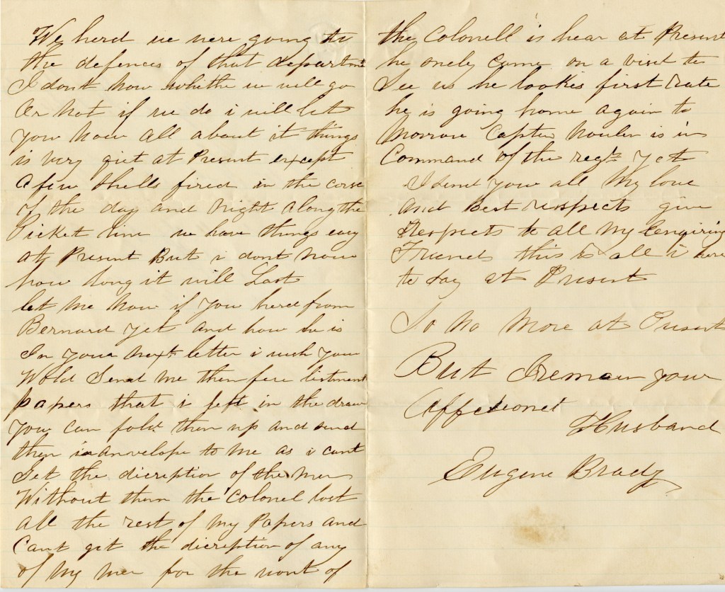 You can fold them up and send them in an envelope to me as I can’t get the description of the men. Without them, the Colonel lost all the rest of my papers and can’t get the description of any of my men for the want of them. The Colonel is here at present. He only came on a visit to see us. He looks first rate. He is going home again tomorrow. Captain Newlin is in command of the Regiment yet. I send you all my love and best respects. Give respects to all my inquiring friends. This is all I have to say at present. So, no more at present. But I remain your affectionate husband,