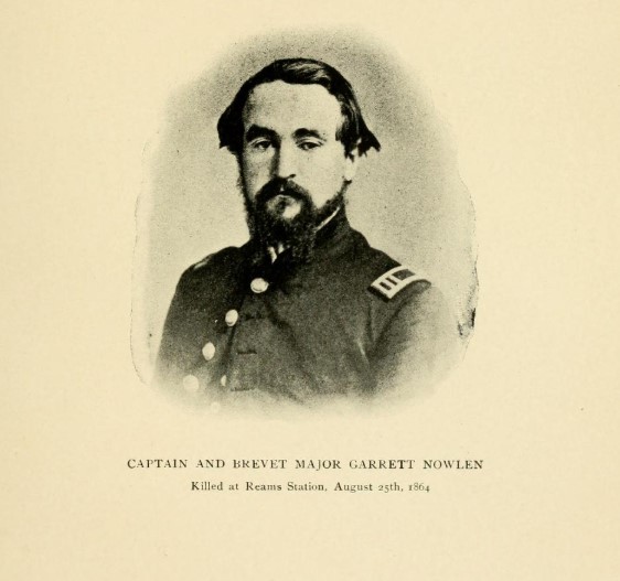 The Battle of Reams Station on August 25, 1864, saw Lieutenant Brady with the 116th defending hastily constructed fortifications against a fierce Confederate assault. Early in the day, Confederate forces advanced, pushing back Union pickets and taking up positions in the surrounding woods. Attempts to reclaim the ground failed, resulting in close-quarters combat and heavy losses. Lieutenant Brady’s letter mentions Captain Garrett Nowlen, whose leadership and bravery left a lasting impression on the men of his Regiment. Nowlen’s heroism was vividly captured during the Battle of Reams Station, where he made the ultimate sacrifice: